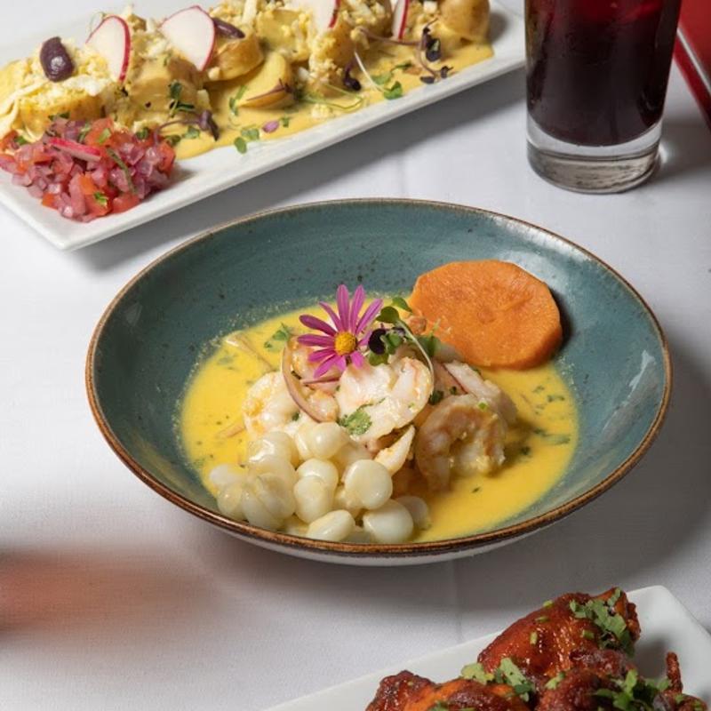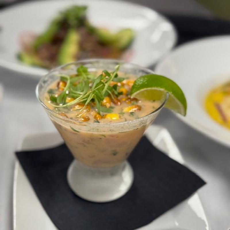 Fresh gulf shrimp and fish, aji amarillo pepper, sweet potatoe, choclo, onions, cilantro.