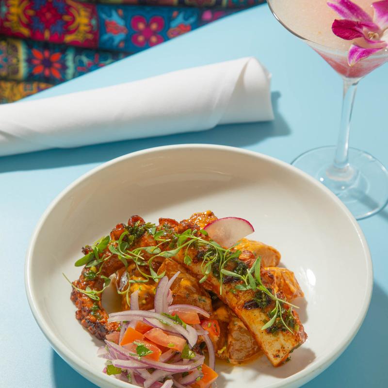 Grilled Octopus arm, aji panca, aoili potatoes, choclo, chimichurri,salsa criolla.