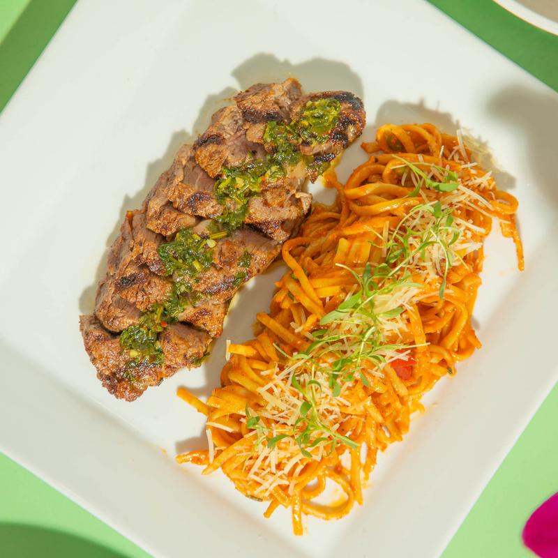 Peruvian-style spaghetti in a creamy spinach and basil sauce,parmesan,pecans,server with juicy steak,cooked to a perfect medium unless otherwise requested.